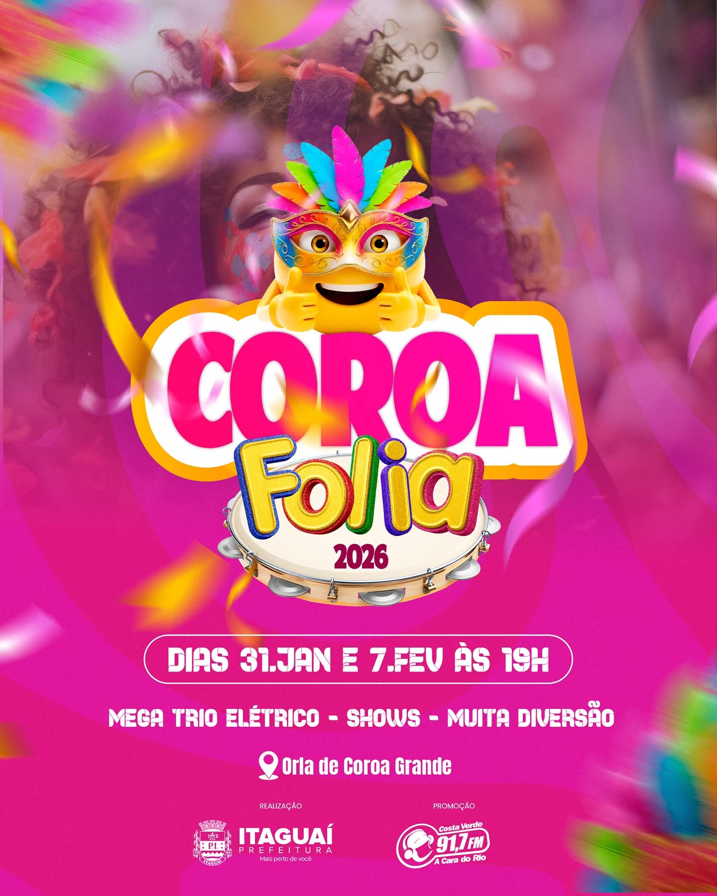 Evento acontece nos dias 31 de janeiro e 7 de fevereiro; Marvvila e O Batuke 021 estão entre os destaques da programação. A temporada de folia já tem data e local para começar na Costa Verde. O Coroa Folia 2026 promete agitar a Orla de Coroa Grande com uma estrutura