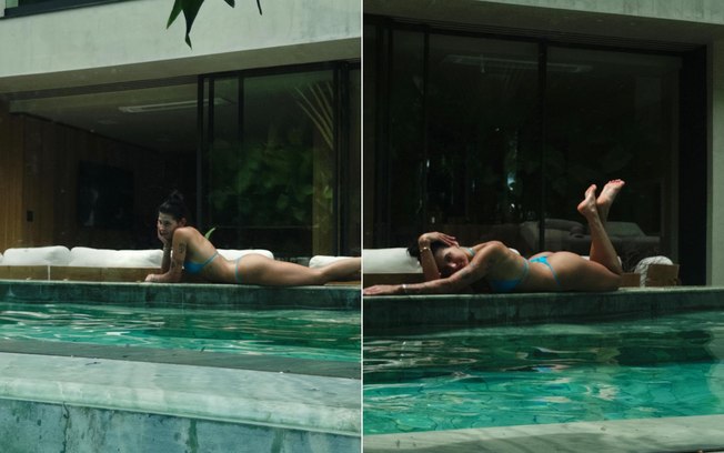 A cantora apareceu em uma sequência de fotos à beira da piscina, usando um biquíni azul enquanto aproveitava o sol e exibia as tatuagens.