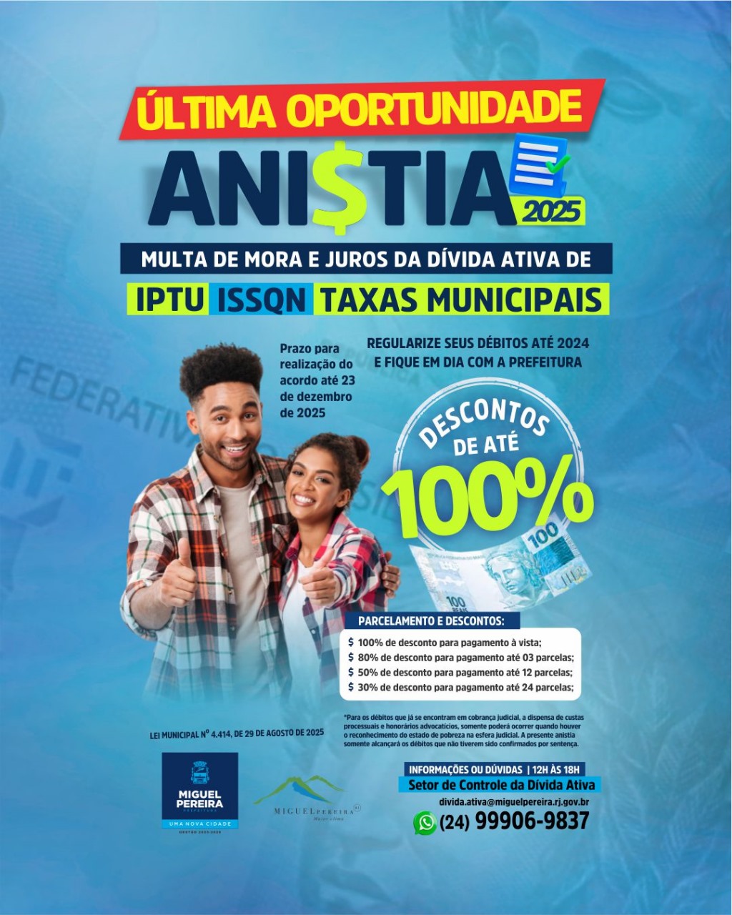 Programa permite regularização de IPTU, ISSQN e Taxas Municipais até 23 de dezembro de 2025, com condições especiais para pagamento à vista ou parcelado A Prefeitura de Miguel Pereira anunciou a última oportunidade para contribuintes regularizarem débitos inscritos em Dívida Ativa relativos a IPTU, ISSQN e demais taxas municipais, com