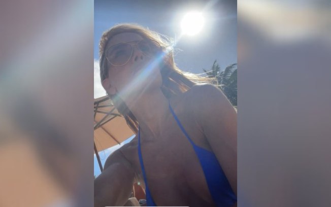 Em um dos stories publicados nesta terça-feira (30), Déborah aparece caminhando em direção ao mar, usando biquíni azul e óculos escuros, enquanto é filmada pelo companheiro.