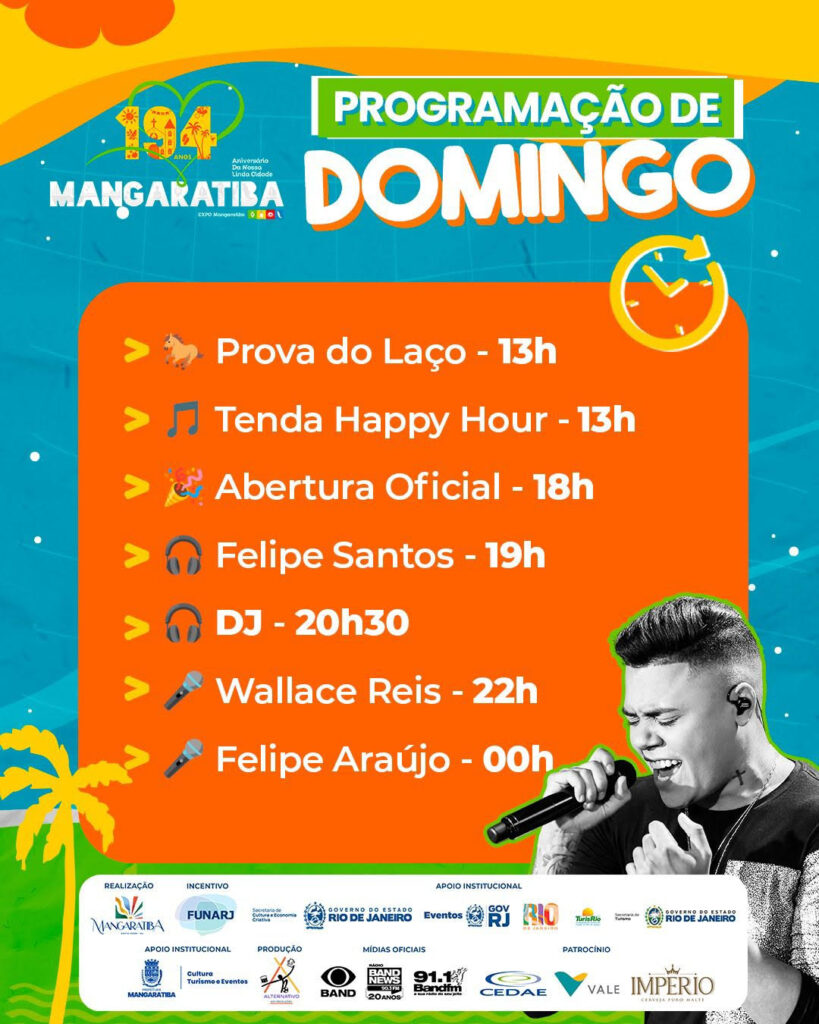 Apesar de ajustes no domingo, as demais atrações seguem mantidas conforme o cronograma original, garantindo que a festa continue sendo um marco de alegria e união para os mangaratibenses.