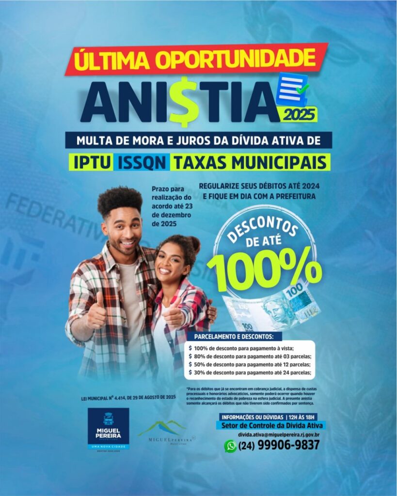 A Prefeitura de Miguel Pereira anunciou a última oportunidade para contribuintes regularizarem débitos inscritos em Dívida Ativa relativos a IPTU, ISSQN e demais taxas municipais, com abatimentos expressivos sobre multa de mora e juros. Amparada pela Lei Municipal nº 4.414, de 29 de agosto de 2025, a iniciativa oferece descontos que podem chegar a 100% para pagamentos à vista, além de condições facilitadas de parcelamento.