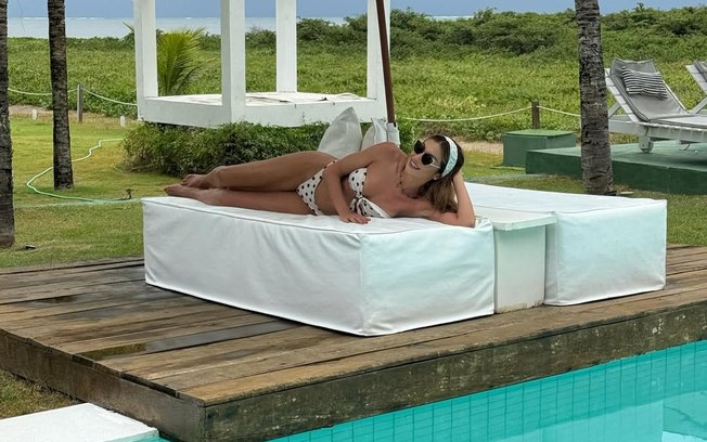 Nas imagens, a jornalista aparece usando um biquíni de bolinhas pretas, que remete às estampas de roupas dessa época. Na ocasião, ela ainda apostava em óculos escuros e um colar preto repleto de pingentes.