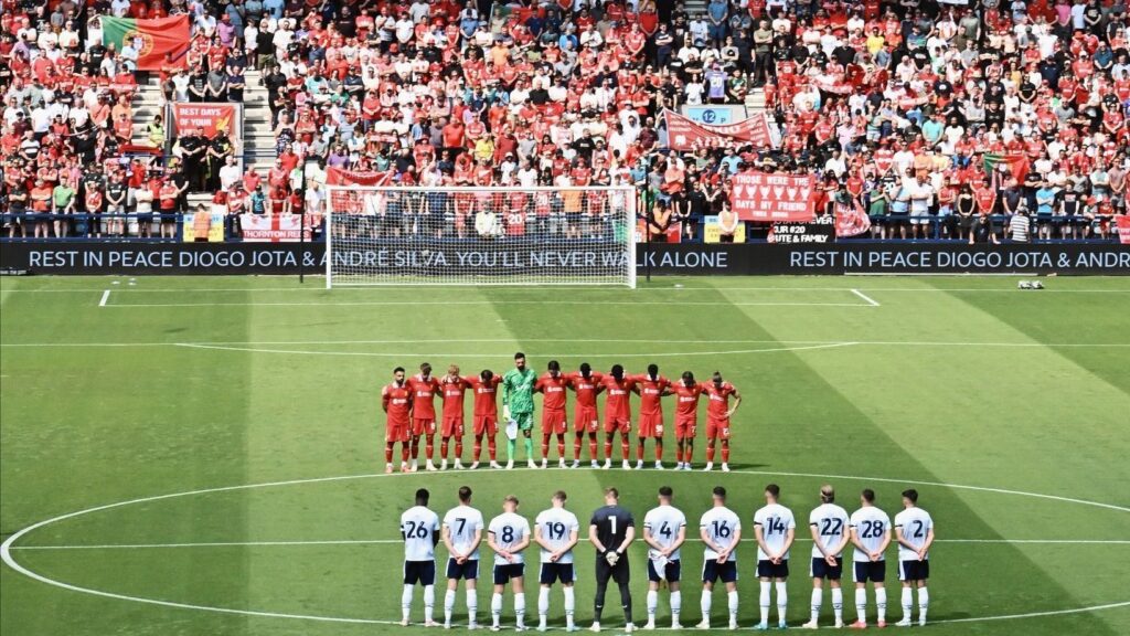 Antes do início do confronto, Benjamin Whiteman, capitão do Preston, deixou uma coroa de flores em frente à torcida do Liverpool em homenagem a Jota ao som de “You’ll Never Walk Alone”.